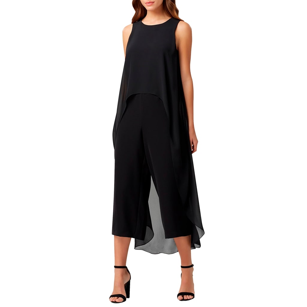Una capa de gasa vaporosa cae por la espalda de manera elegante en este jumpsuit sin mangas, diseñado con una silueta corta de pierna ancha y bolsillos en las costuras.
