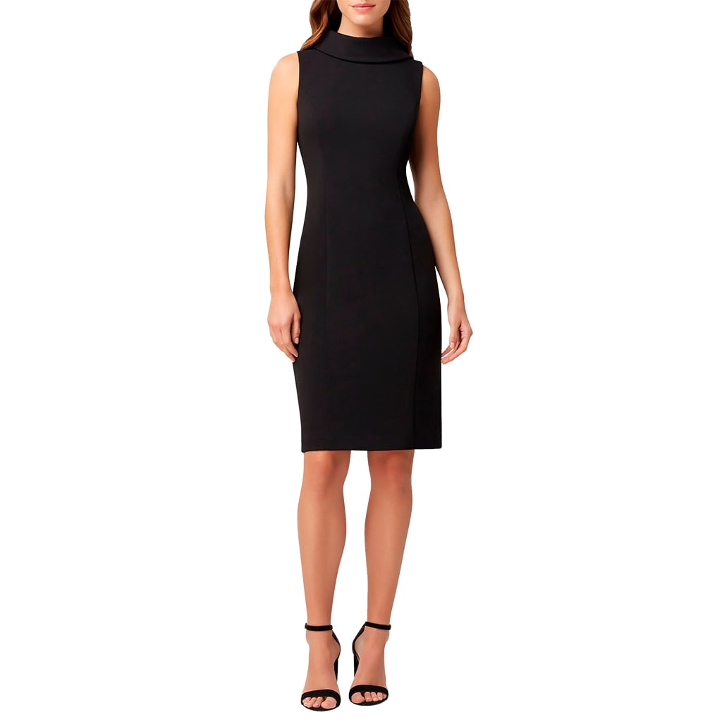 Este es un vestido con un cuello envolvente que termina en una corbata con tapa de metal echada sobre un hombro.