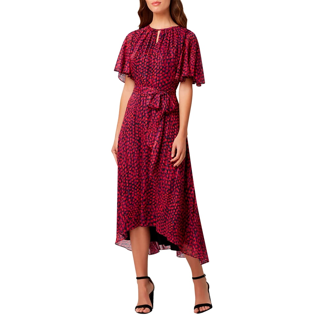 Dale un color vibrante a tu día (o noche) con este vestido festivo, hecho con una falda amplia y mangas onduladas de fantasía.