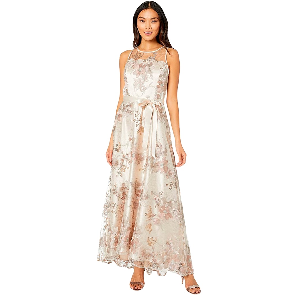 Este vestido sin mangas, presenta una silueta de columna, cinta ajustable en la cintura y un bordado floral en una fabricación de nailon forrado.